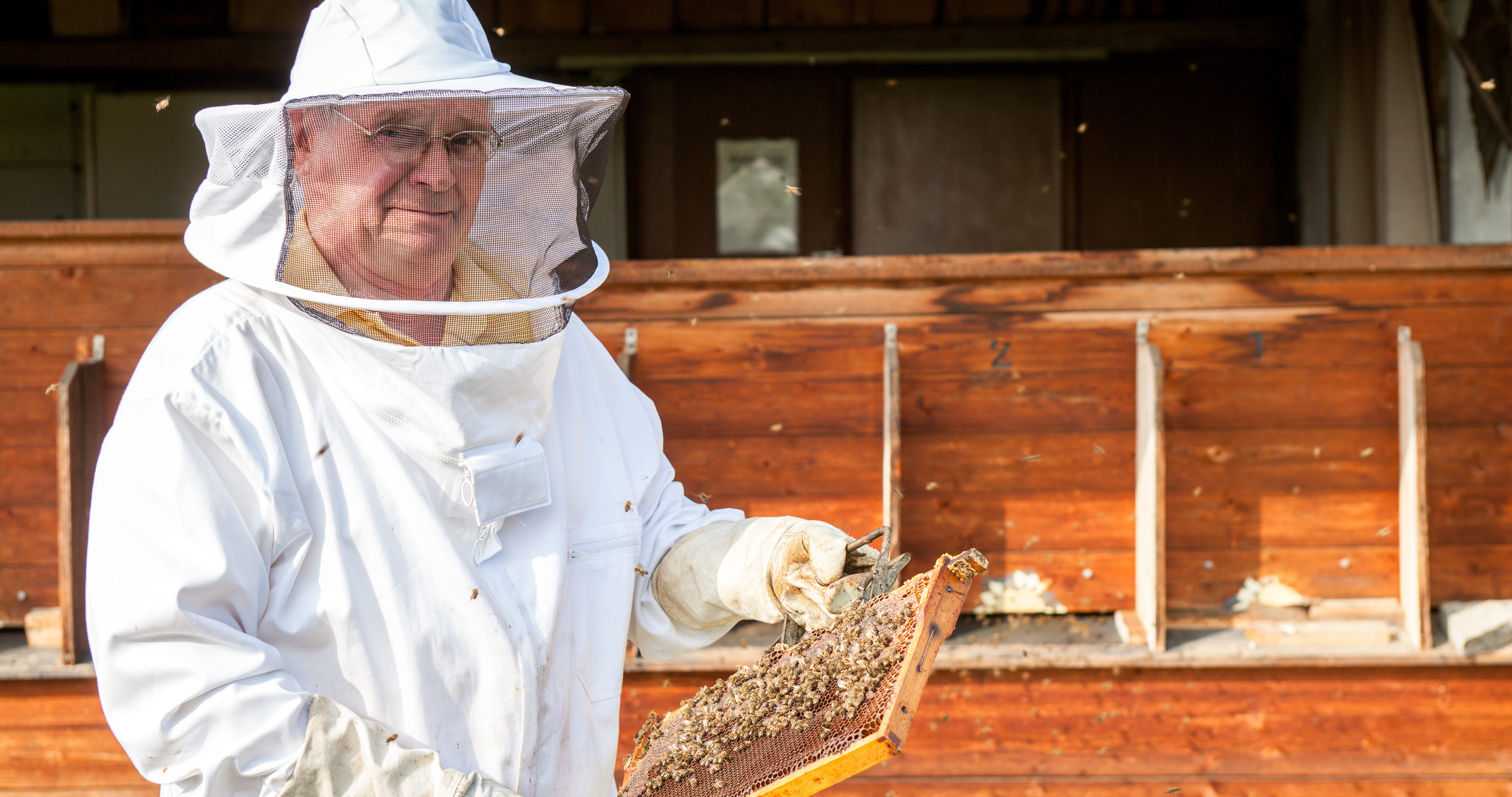 Our 100% unprocessed honey is spun by hand. The first batch of the year is eagerly awaited in May, with the appearance of the first fruit tree blossoms. From mid-May to the end of the month, rapeseed and chestnut honey is abundant, prized by customers for its white colour and creamy consistency. From June to July, it is the turn of the robinias (acacias) and lime trees, which make for yellow, runny honey. The last push of the year is thanks to the nectar of raspberries, blackberries, clematis and white clover: this final shift produces dark honey, with a thick consistency. You can buy honey directly from Mr Wonigkeit for 4 Euros per jar (plus a 50c deposit). You will find him and the hives on our estate, near to Coblenz.
