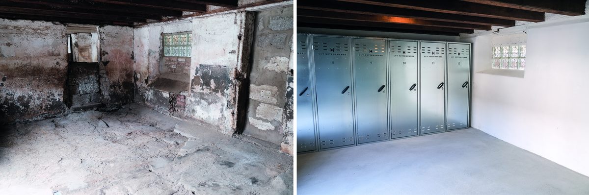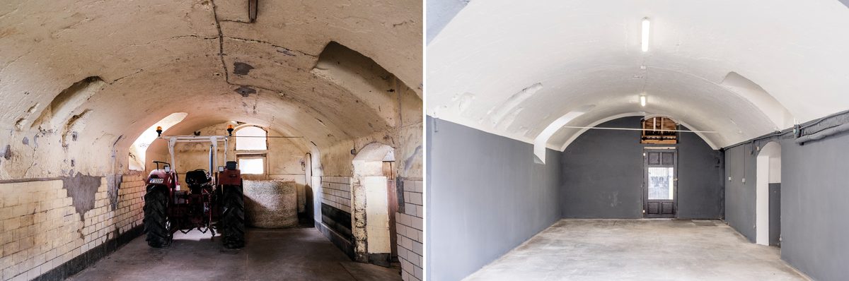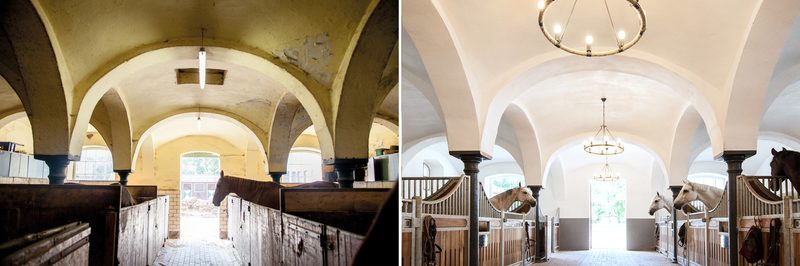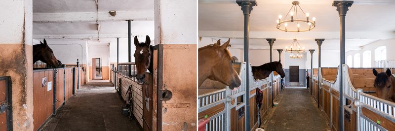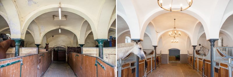 In order to restore the original beauty of the historic stables, bricked-up windows and partition walls were opened up, new floors poured, vaulted domes renovated and dilapidated pillars replaced. In the outdoor area, simple small stalls were converted into paddock stalls with a generous run. A stream was re-naturalised, earth was moved, deep lava stone layers were installed for mud-free runs, and trees were planted.