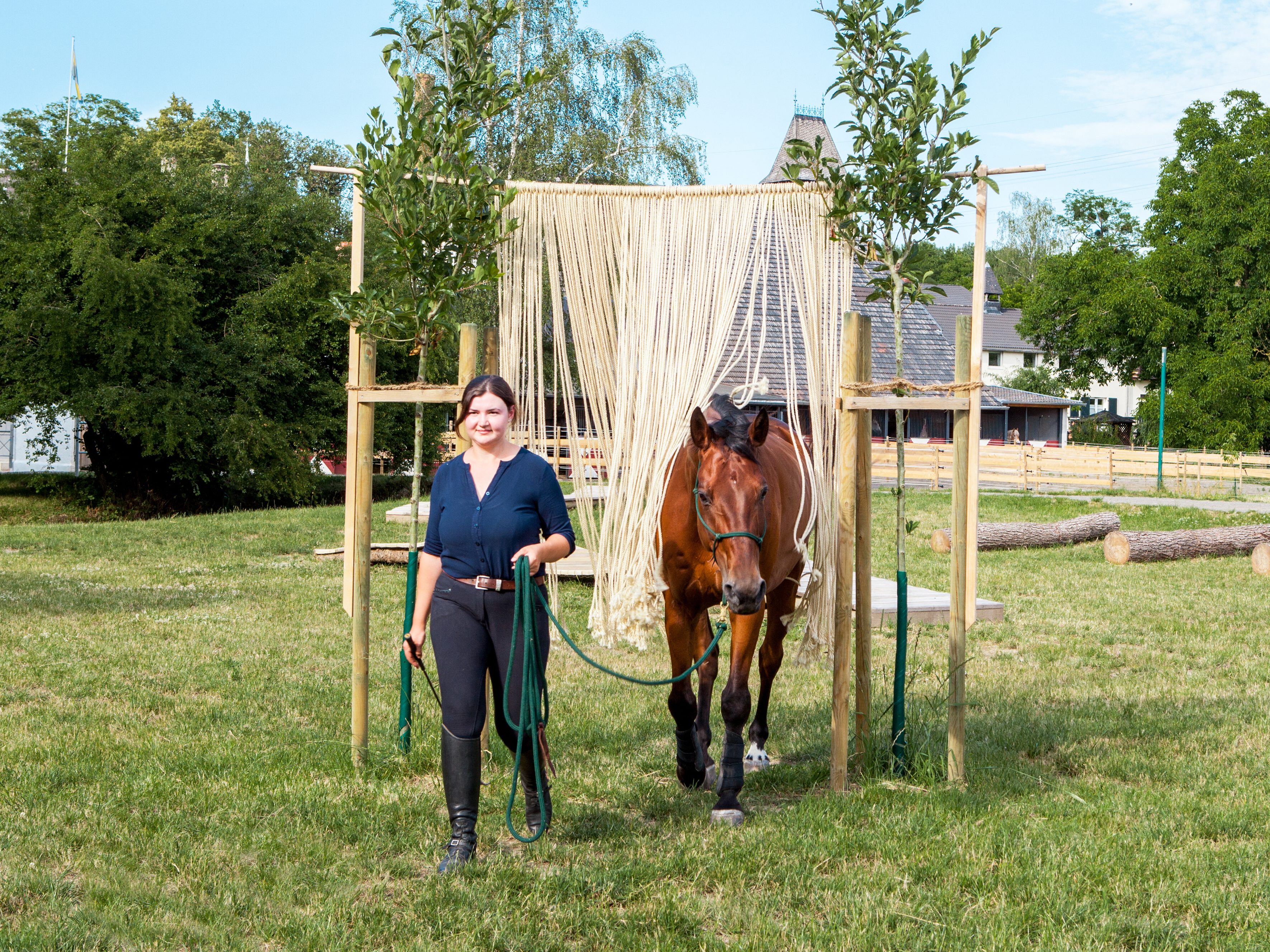 Natural materials form a curtain that offers an integral aspect of composure training: the goal is for the horse to be ridden or led through the curtain without stress. Through relaxed body language, composure and time, the human supports the horse in calmly walking through the curtain and perceiving this not as stress but as an exciting challenge.