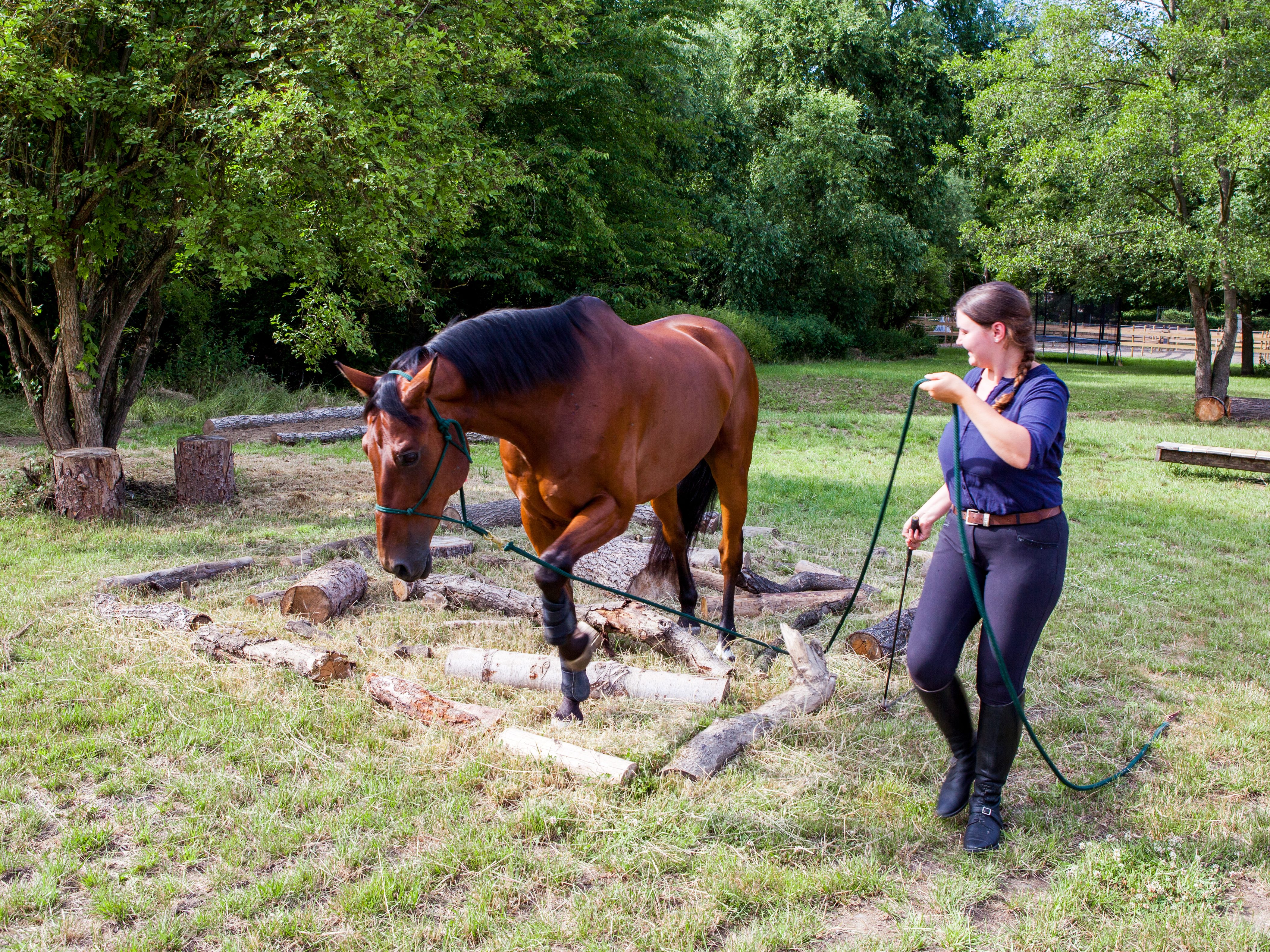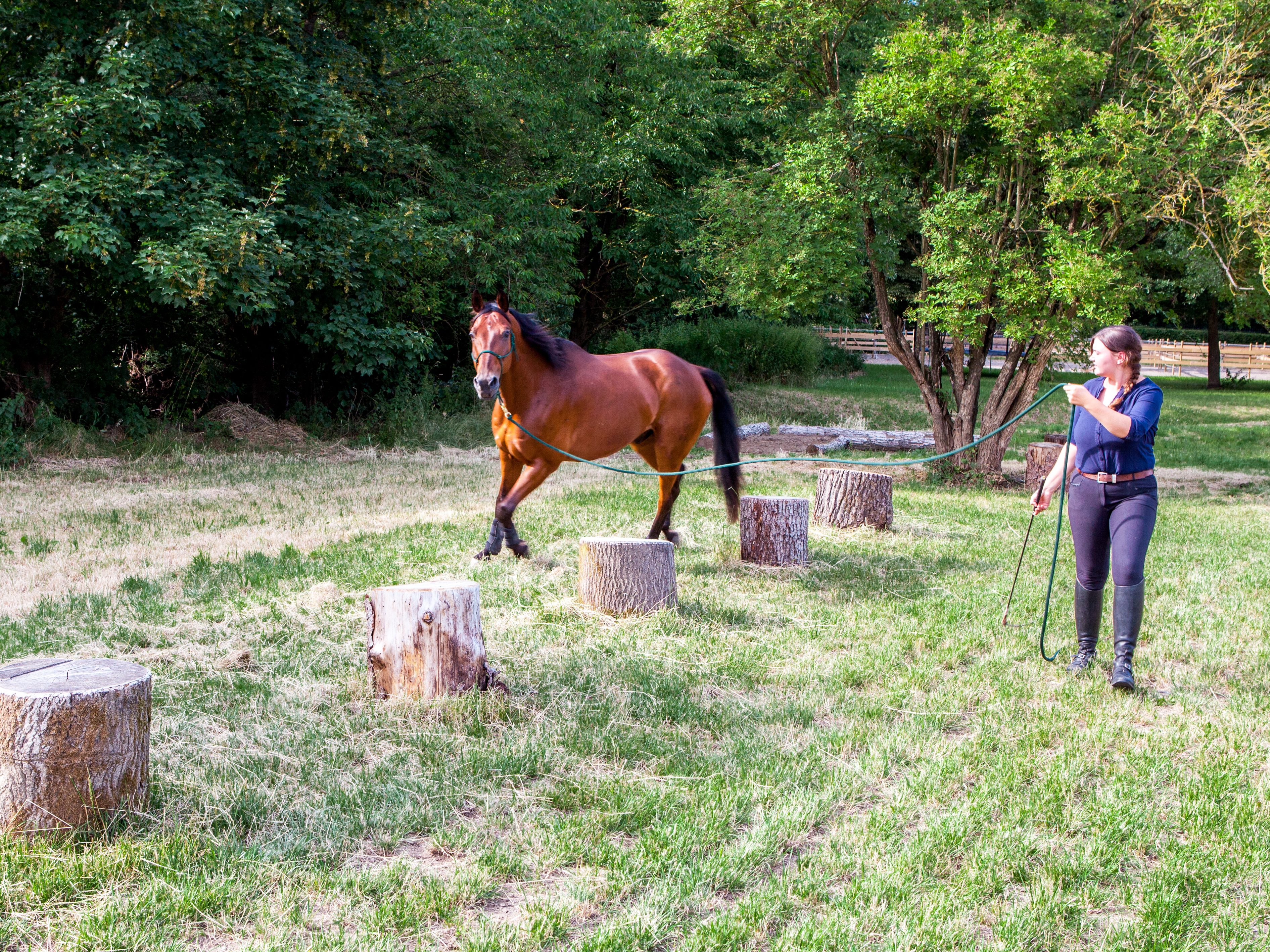 Five equally-spaced tree stumps are used for slalom training - on lead rope or ridden - as well as for lunging at different lengths. The human guides the horse at a distance with precise aids, requiring clear communication. Positive training outcomes include flexibility, agility, balance and coordination.