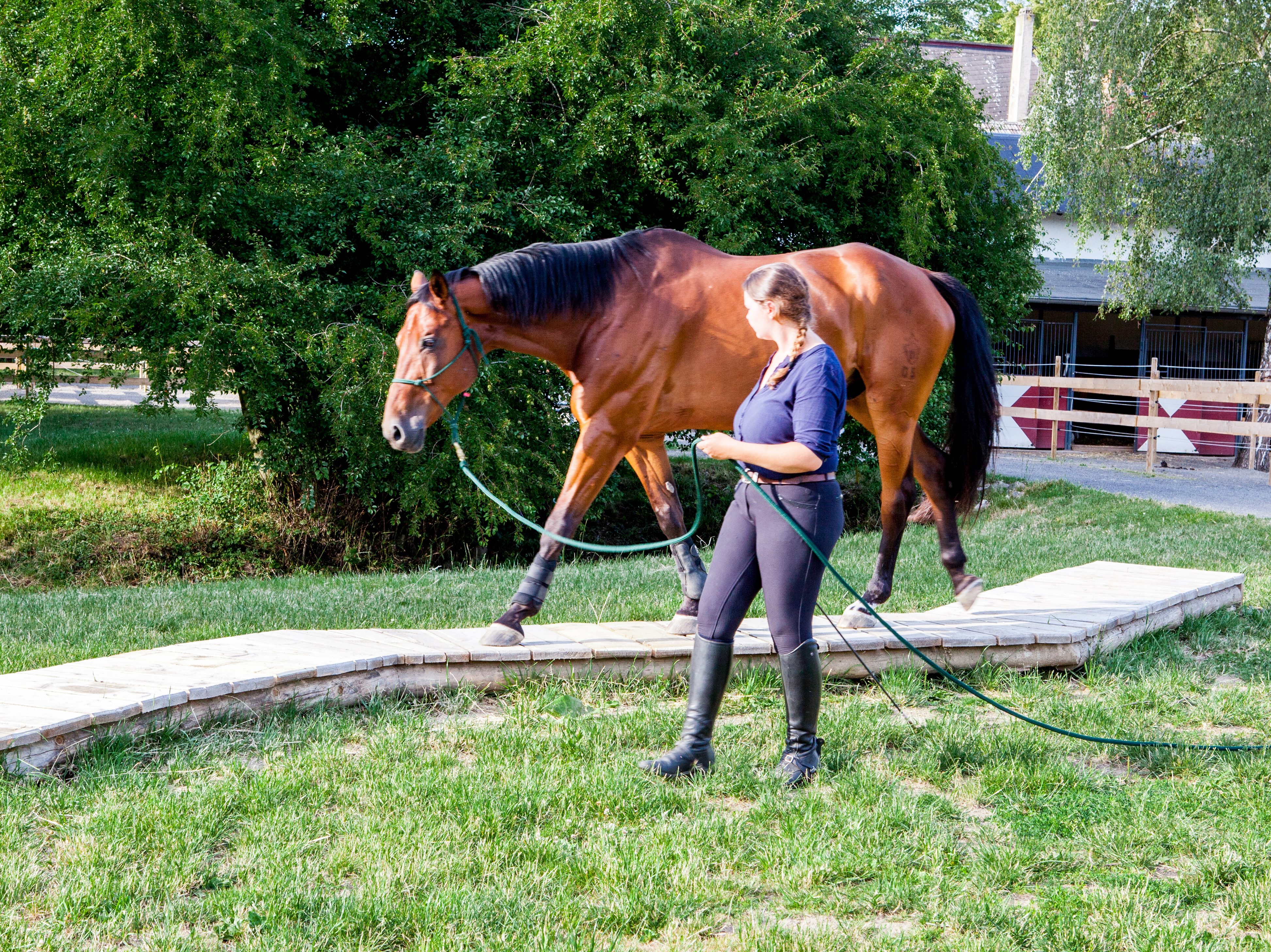 Riding our trail course is not a race; rather, it is essential that you form a close unit of trust with your horse, resting upon finely attuned communication. The horse explores the obstacles on its own initiative and at its own pace - by probing with its hoof or sniffing. During this training, the horse builds its trust, both in itself and in humans: an important lesson for the mutual relationship and for subsequent training!