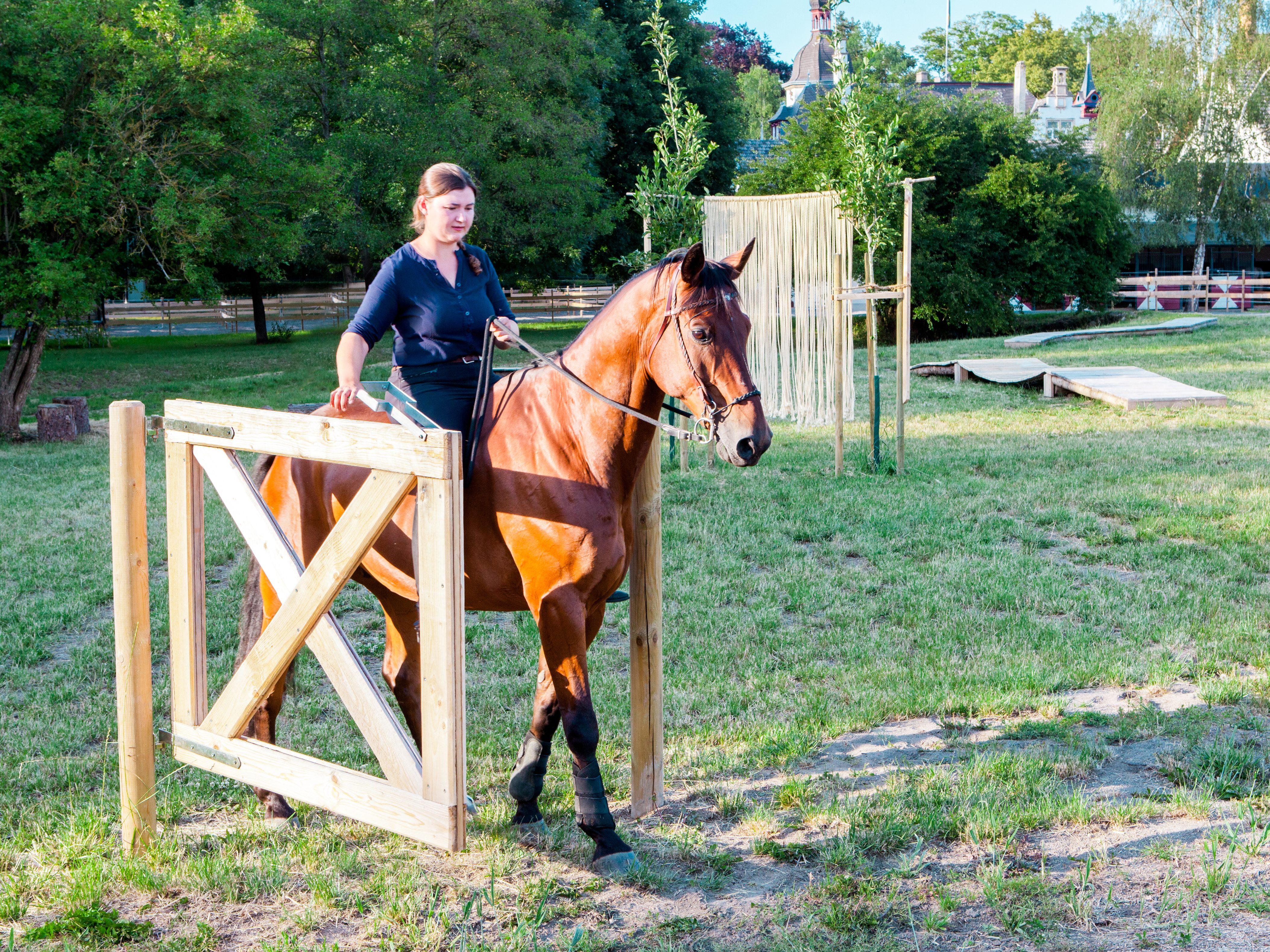 A trail course classic: on horseback, the rider opens the gate, rides through it and closes it behind him. Both rider and horse must concentrate and work precisely. The rider uses finely-tuned prompts to control the hindquarters in particular. While the rider improves one-handed rein control, the horse develops concentration, rideability and obedience.